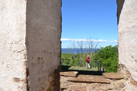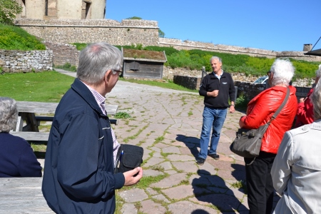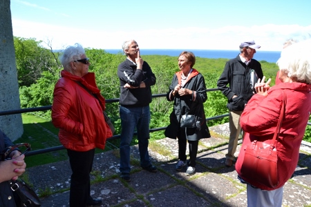 Vid tio-tiden på förmiddagen samlades vår grupp vid Borgholms slott där Kastelan Jim Rudolfsson mötte upp för att berätta och guida oss runt i den gamla slottsruinen. Med sin goda berättarkonst fick vi på ett inlevelsefullt och intressant sätt ta del av den kunskap som Kastelanen besitter angående historien om Borgholms slott. Borgholms slotts ursprung går tillbak till 1100-talet. Då började man bygga ett torn som kan ha varit lika högt som fyren Långe Jan.I början av 1200-talet byggdes en ringmur runt tornet och den torde ha stått klar 1281. Inne på borggården finns en rund stensättning i marknivå där tornet en gång stod. Danskarnas ständiga anfall mot Sverig under 1500-talet