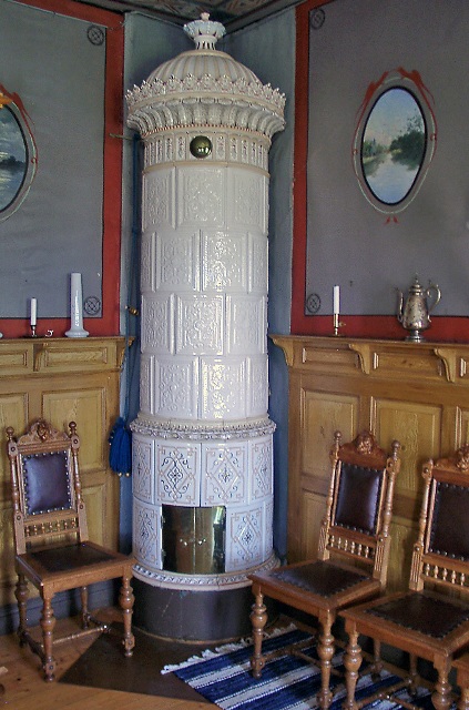 I huset finns många vackra inredningsdetaljer, t.ex två likadana kakelugnar.